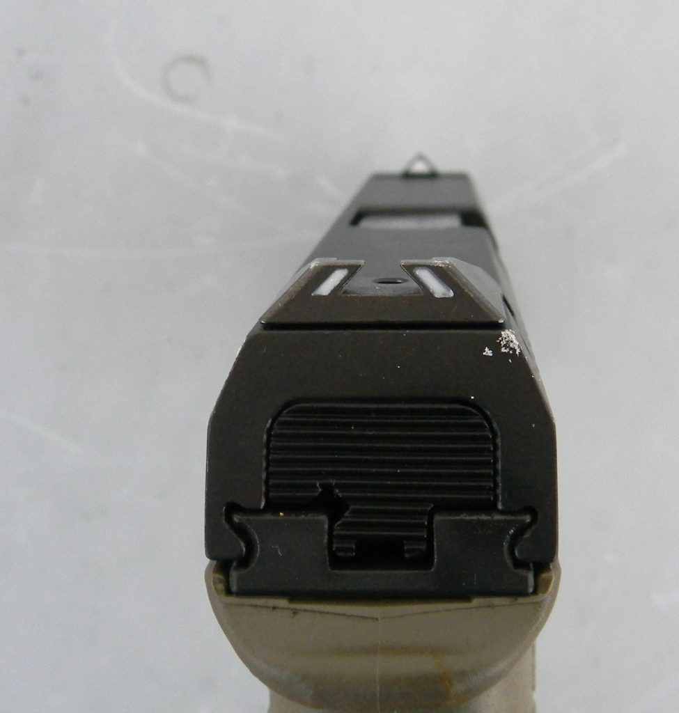 The pistol was lubricated along the long bearing surfaces and barrel hood before firing. I noted the pistol sets low in the hand and feels better than any other polymer frame 9mm in the safe. The two supplied 17 round magazines were loaded with Fiocchi Shooting Dynamic 115 grain FMJ ammunition. I placed man sized targets at seven yards for the initial evaluation. Drawing quickly and getting on target the pistol exhibited excellent results. Control is good and recoil is modest for a pistol of this size and weight. The proof of the pistol’s efficiency was at 15 yards. At this range control remained good. The sights are a good design for combat use. Once you acclimate there are advantages. If you do not think these sights are an advantage XS sights offers a tritium replacement set. Link below at Midwayusa.com