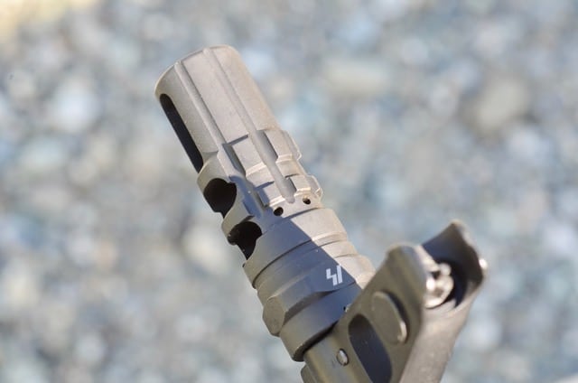 When I first received the Strike Industries J Comp V2 I noticed its longer than most other muzzle devices I have experience with. This isn’t a negative thing just a general observation about its dimensions. The J Comp V2 is a good-looking muzzle device and the designers seemed to work a blend of form and function to give a part as small as a muzzle device a bit of flare to it. Further inspection of the J Comp V2 shows that the device features two large chambers and two smaller chambers located in the 3 and 9 o’ clock positions. They definitely will expel any concussive force away from the shooter and keep the muzzle from rising during rapid firing.