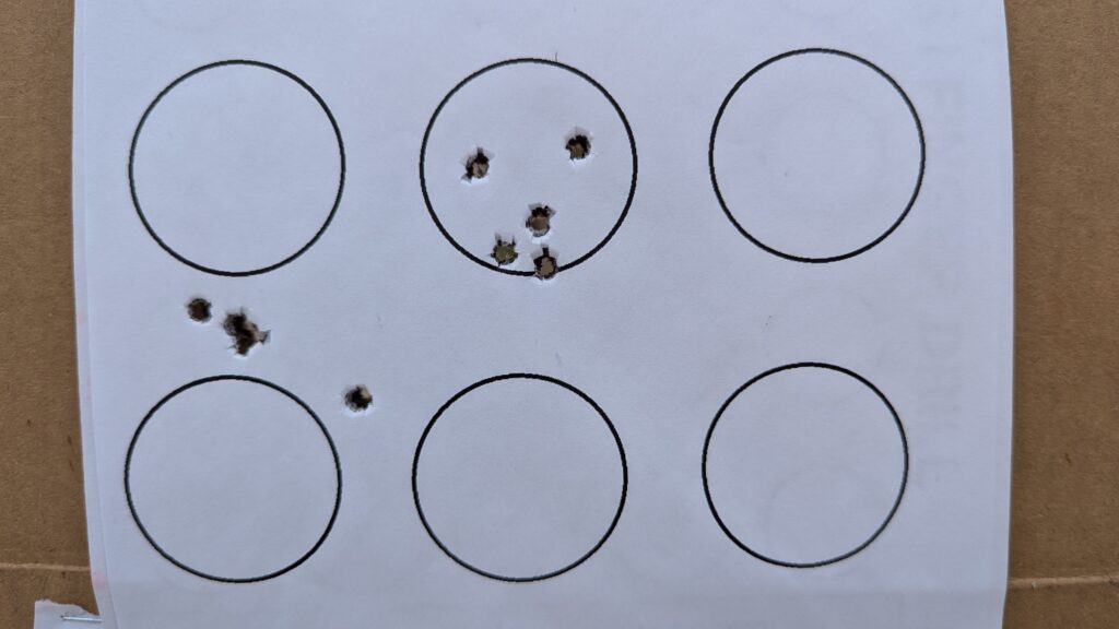 I aimed dead center as best I could, but the rounds all hit high. One hit to the right, but that was my fault, flyer. Outside the flyer, the second group was tighter. That’s because, between strings of fire, I added a pistol box to my range bag, which made it a sturdier rest than just the bag.