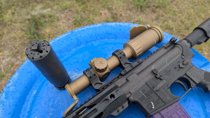 As established, it depends, but for fun, I took my only suppressed AR out and launched some lead. I originally zeroed the SAI 1-6X with the suppressor in place with a simple 50/200 zero. I returned to the 50-yard line and used a series of two-inch dots to test the difference between firing suppressed and firing unsuppressed.