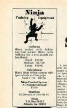Ever want Ninja Training Gear? If so, then Soldier of Fortune had you covered back in the day. The ad promises ninja uniforms that include a black jacket with a hidden shuriken pocket, black pants, two arm guards, and a headband!