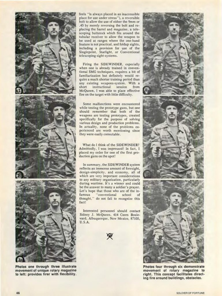 My personal favorite firearm featured in Soldier of Fortune was the Sidewinder SMG. This bicep braced SMG utilizes a magazine well that can be rotated 360 degrees. It can be used with one hand, and as such, they most certainly dual-wielded full auto SMGs in the issue.