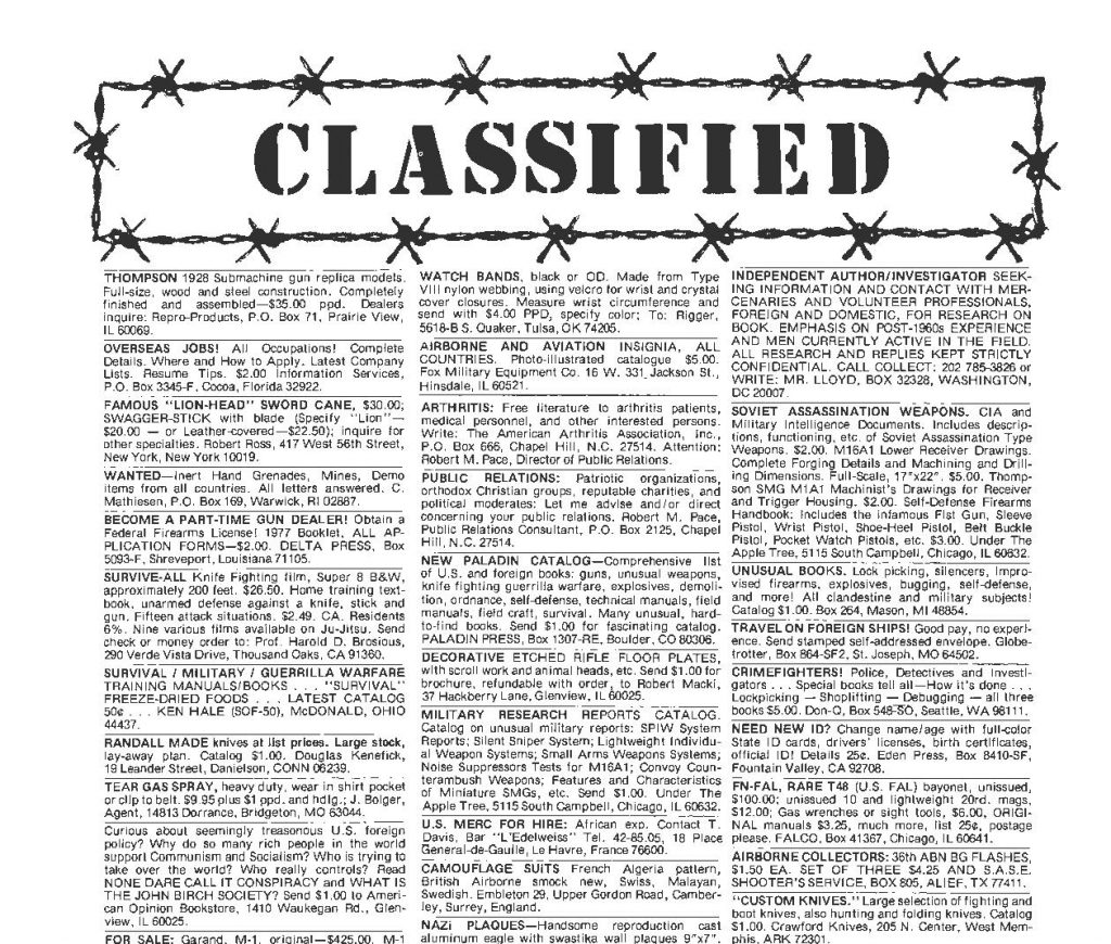 Soldier of Fortune famously listed jobs for those looking for all sorts of work. Heck, they got sued over a few times when hitmen were hired from the Soldier of Fortune classifieds. Beyond the hitmen and mercenaries, we have guns for sale, recipes for explosives, and P.I.s looking for work.
