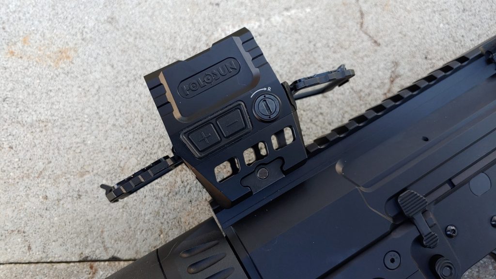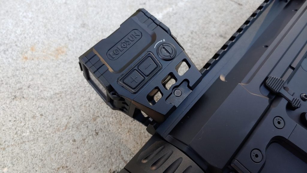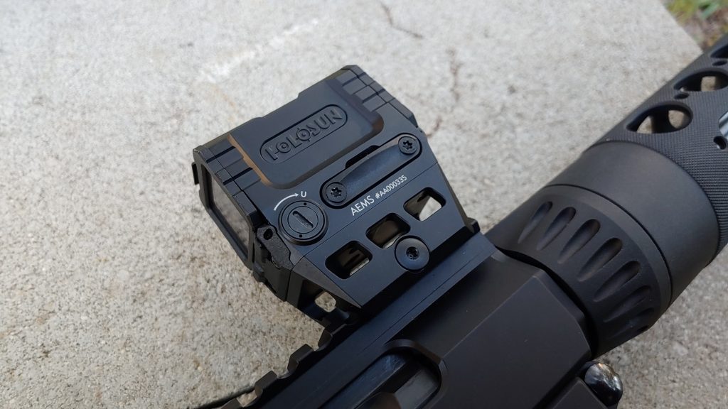 The height is actually impressive. Most optics that tall only offer an absolute co-witness with AR height sights, but Holosun found a way to keep the optic low and the screen free from a blocked absolute co-witness view. Currently, the mount is proprietary and is only available at one height. That is a downside, but Holosun plans to offer various height mounts for the AEMS. Aftermarket companies are also seeking to introduce mounts of various heights.