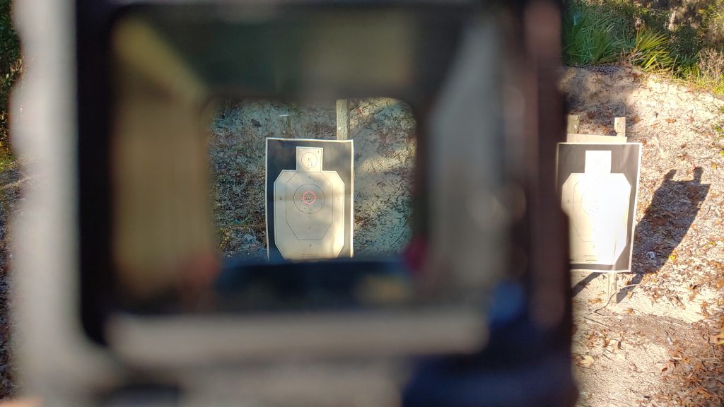 The view through the AEMS is crystal clear. There is a very slight blue tint, but not much. The AEMS comes with two lens covers that are transparent and ultimately disposable. Holosun offers replacements. I found both of these lenses superbly clear and never bothered to pop them down for shooting. They offer outstanding protection and are a great feature.