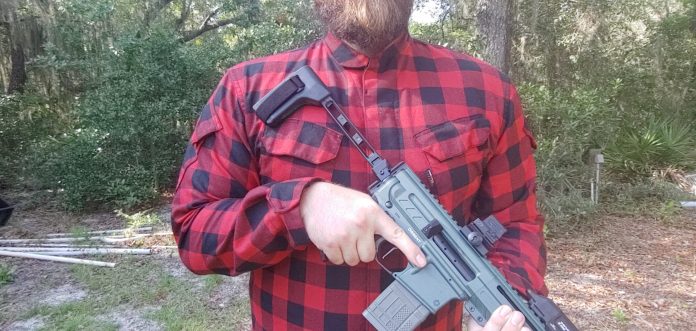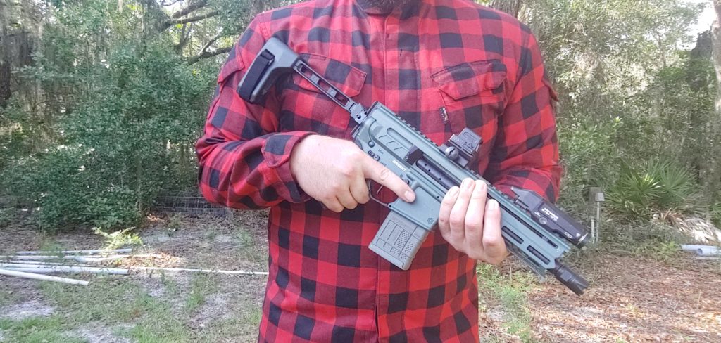 I tend to like clothes that make it easier to conceal and carry. That fit style of the All Skill No Luck flannel is perfect for carrying. It’s a little baggier around the belly. Therefore baggier around your gun makes it easier to hide. I can drop my favorite CZ P09 with a Streamlight TLR-1 equipped into a Phlster Floodlight and make it disappear under my flannel.