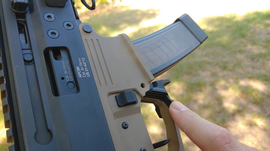 The Lingle lower uses a Scorpion magazine release that’s quasi-AK-like, and it comes with a Strike Industries mag release. The lower retains the best qualities of the APC9K lower, including total ambidexterity. It uses an AR pistol grip of your choice as well as a mostly AR 15 lower parts kit