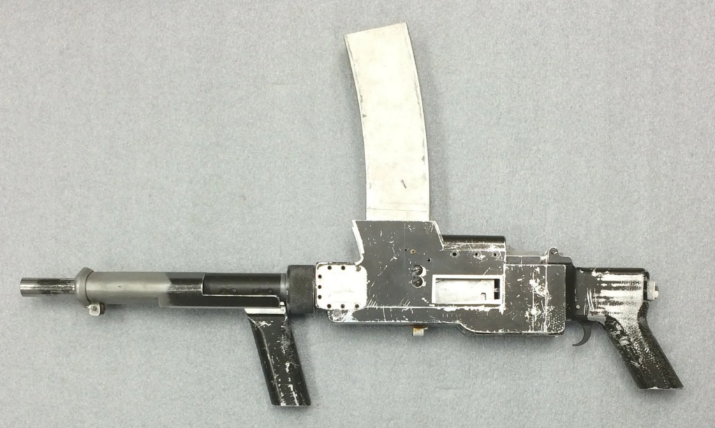 Carroll Childers was clearly a creative man. The SOW used a blow-forward operation and was full auto only. The gun had a cyclic rate of 200 rounds per minute and was fed from a top-mounted 10-round magazine. The SOW lacked a stock and instead had a forward and aft pistol grip. The gun was designed to be fired from the hip.