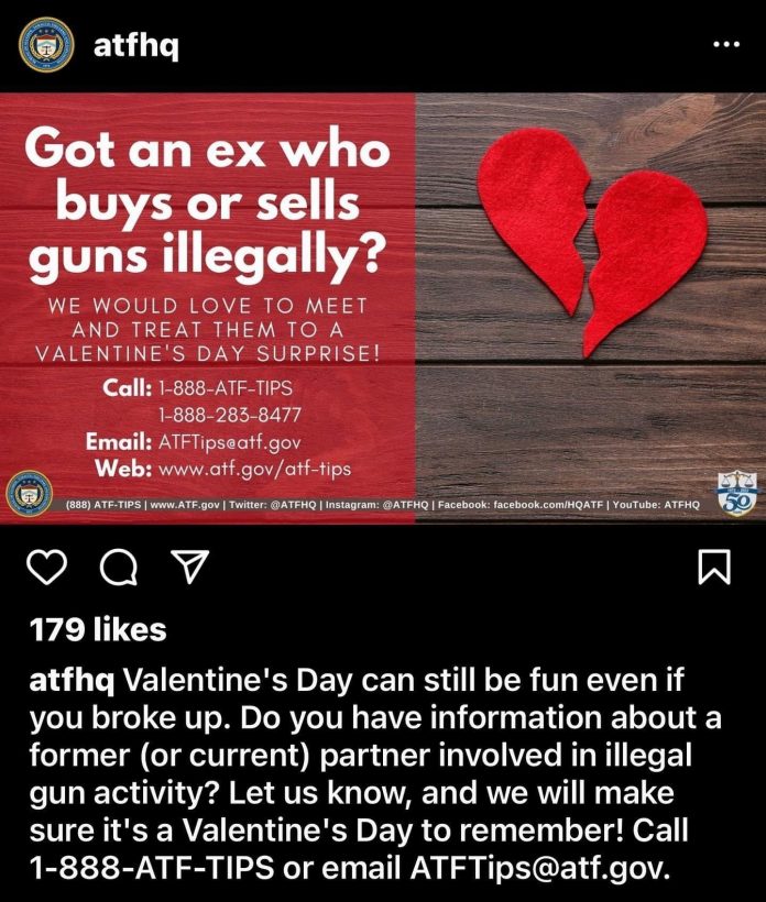 It seems farcical, but it is the absolute honest Valentine’s Day post from the ATF. Snitch on your ex for revenge. Ballsy. Bold. Progressive even!