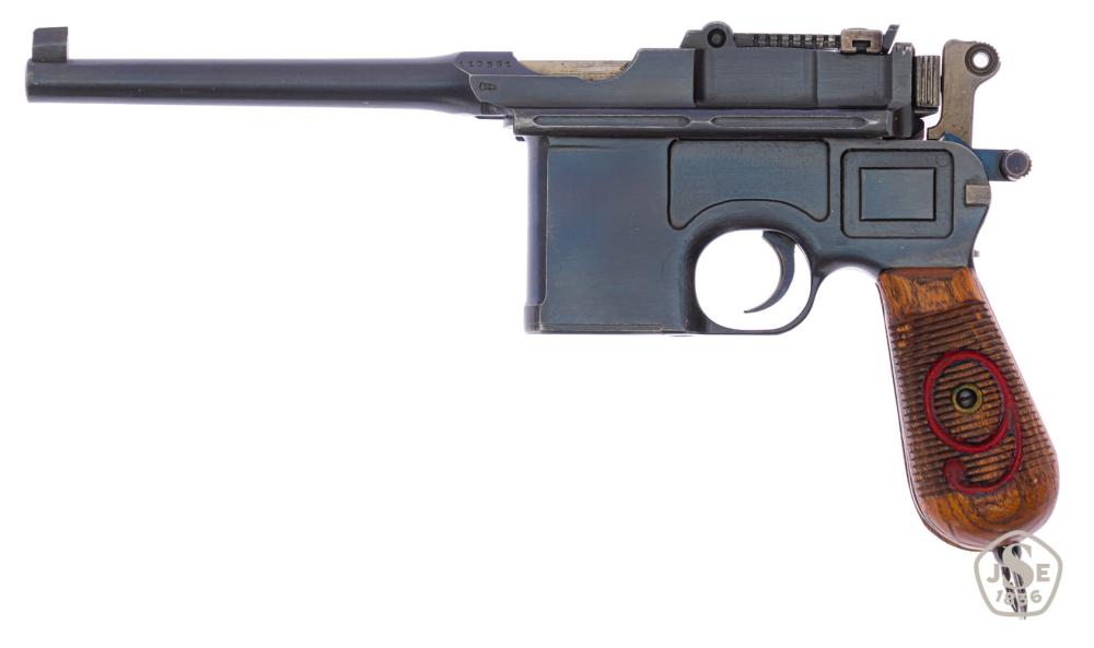 Another somewhat popular pistol with the German army was the Mauser C96. This was one of the earliest automatic handguns and one of the most widely produced. The Luger was slow to produce, so the German military ordered 150,000 C96 pistols in 9mm. These became known as the Red 9 Mausers.