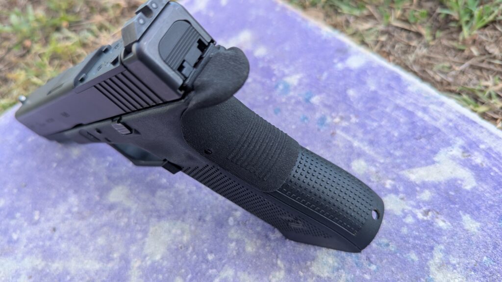 The Beave aims to provide a beavertail without the excessive bulk that Glock adds to its own beavertail adapter. Its super-small design is very thin and adds minimal bulk to the grip. Installation requires little effort. All I had to do was remove a pin from the Glock’s grip using a punch.