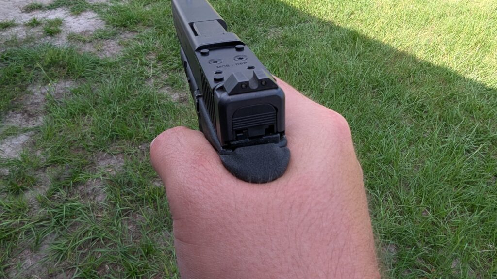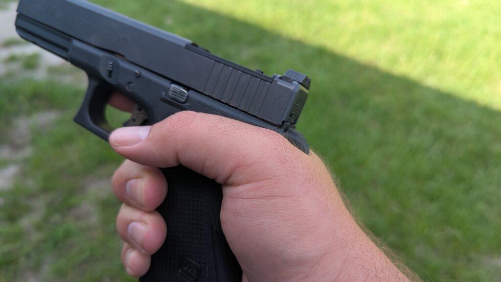 Please excuse the lack of optics on my Glock 17 MOS. I’m currently in the midst of “handgun Barbie” and swapping accessories around. My iron sights were more than sufficient to test The Beave, so don’t fret. With The Beave installed, I did some basic shooting, and guess what? No more slide bite! I could grip high and tight—a grip principle that significantly helps increase control.