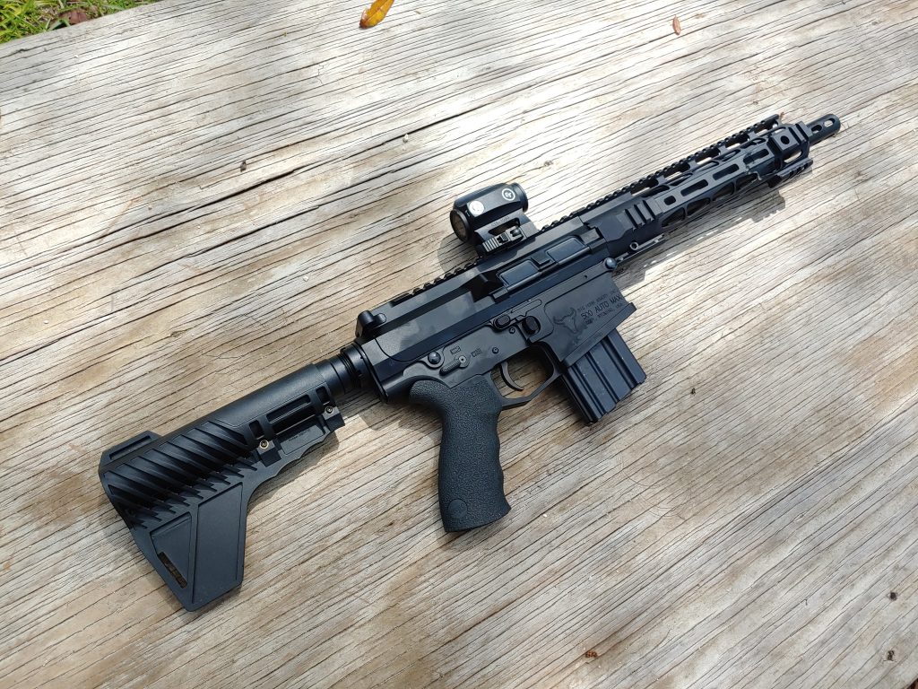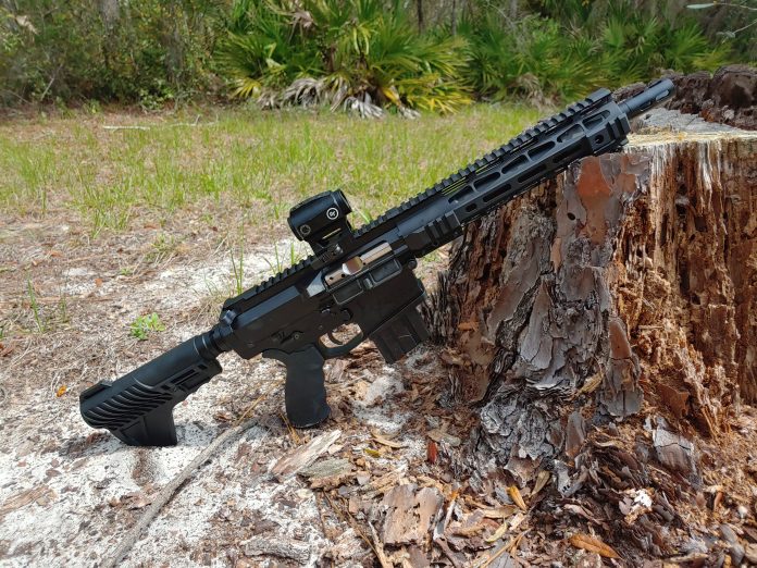 The M-LOK handguard is modern and feels somewhat lightweight. I’d imagine they attempted to cut some weight when possible, and the M-LOK handguard is one way to go about that. It’s trim, slim, looks good, and provides plenty of mounting options. The brace is where we get into some interesting territory. It’s a blade-style brace on a weapon that essentially shoots a 500 S&W Magnum round.