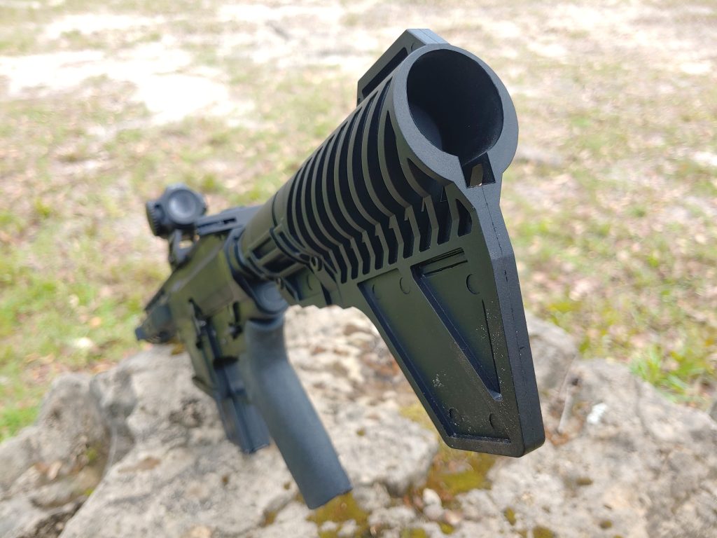 That’s not the best brace for the gun by far. At the tip of the barrel, we get a chunky muzzle brake to help tame the beast. Our BCG is ridiculous and massive, and I imagine it has to be. About the only thing small and non-beefy is the charging handle and pistol grip.