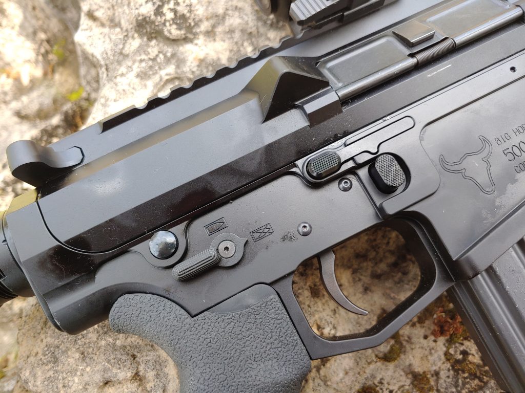 Everything about this gun is beefy. It’s huge all the way around. The nine-round magazine is massive and is roughly the same length as a AR 15 20-round magazine. Big Horn Armory installed a large, ambidextrous safety, a beefy magazine release, and an ambidextrous bolt lock to make the weapon fairly ergonomic.
