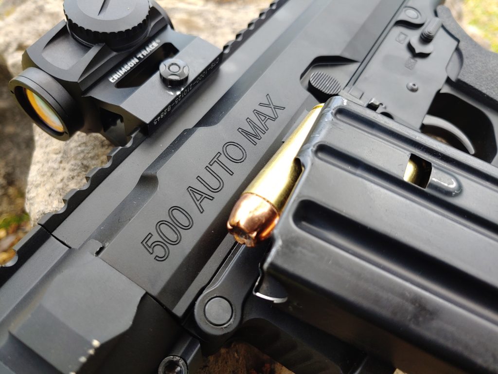 The 500 Auto Max is a brutal round that can use a multitude of projectile weights. A 350-grain projectile hits with over 2,000-foot-pounds of energy within 100 yards. Like most straight-walled, big bore cartridges, this isn’t a long-range round. It’s designed for hunting within a couple of hundred yards at most.