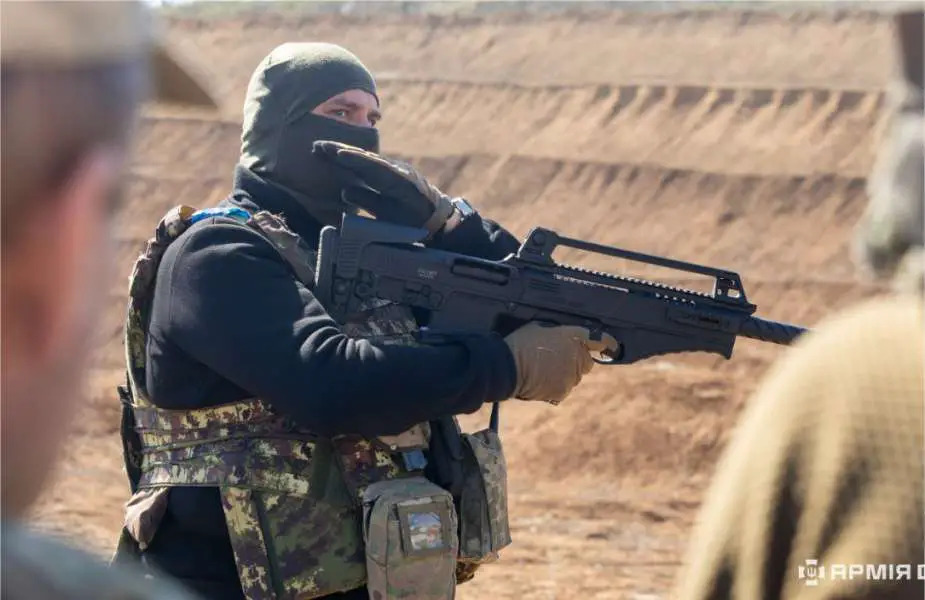 The Escort BTS-12 shotgun is a gas-operated bullpup shotgun that’s magazine-fed. The included magazines hold five rounds of ammo, and the gun can chamber up to a 3-inch cartridge. There are a few models of the BTS-12, and it seems like the Ukrainians have an older model with carry handle fixed sights.