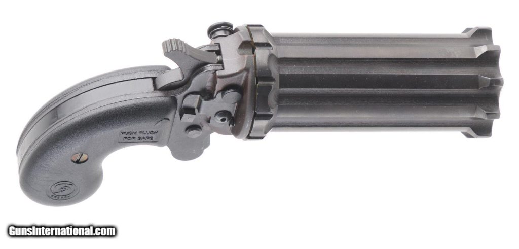 A less common version of the Cobray Pepperbox is a ten-shot .22 Magnum pepperbox that’s also built on the derringer frame. There is some cleverness to the design. Each barrel has its own front and rear sights, and while silly, it’s likely a lot easier to shoot than the .45 Colt and .410 pepperbox.