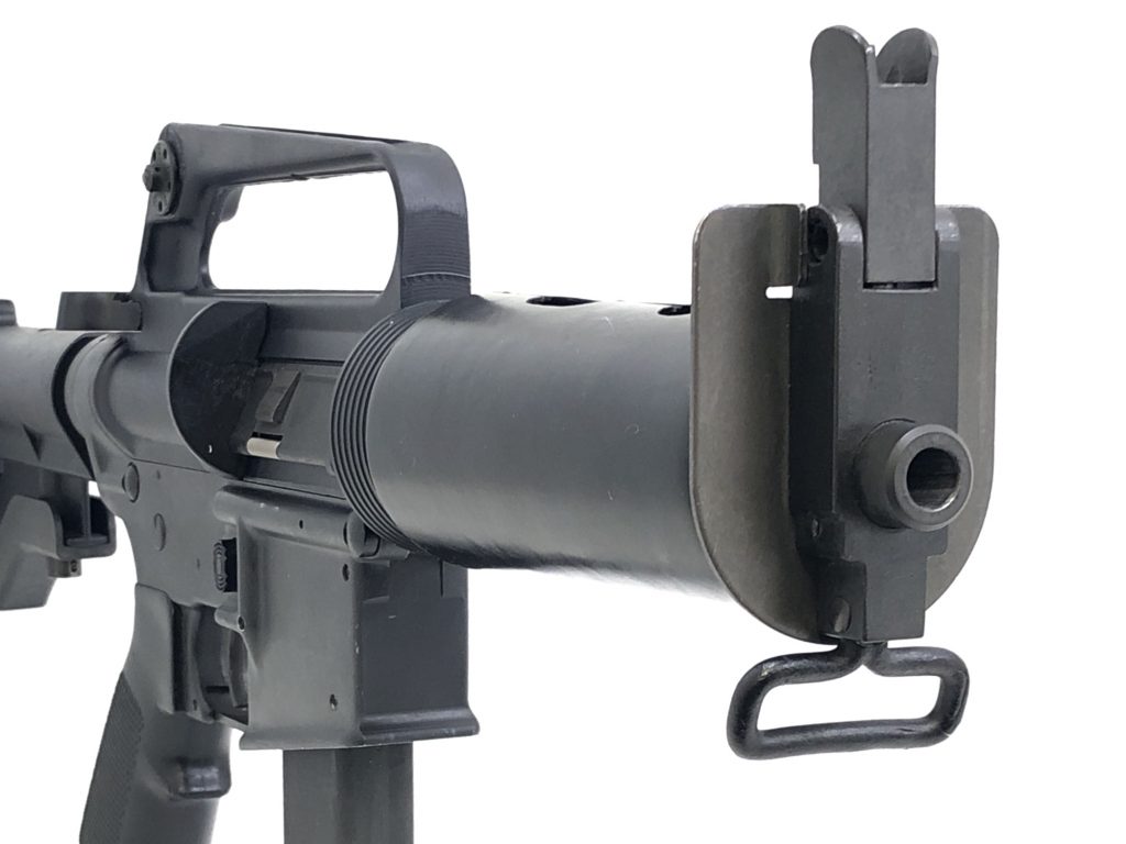 Colt took the handguard from the M231 Port Firing weapon and installed it on the shorty R0633 DOE SMG. You’ll see pictures of a prototype floating around with an aluminum forend, but as far as I can tell, this was never standard production.