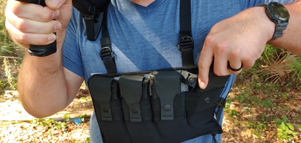 As a chest rig, I orientated the magazines upwards in a traditional configuration. I could ditch the flaps by tucking them rearward into the hoop and loop behind the magazine pouches. The pouches themselves are tight enough to retain the magazines without issue. The flaps button close and don’t present a challenge to reloading.