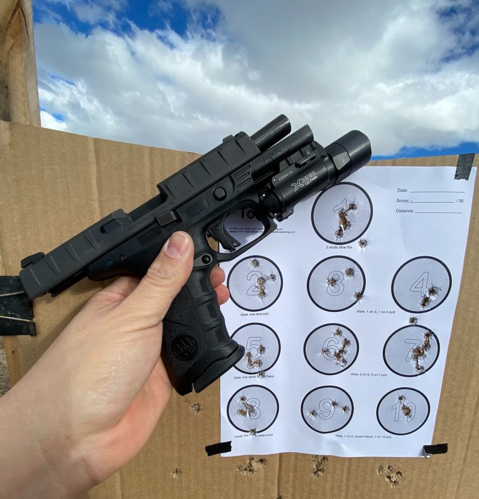 Besides their affordable prices and usefulness, the saving grace of the APX is the fact that it has many common parts that are cross generationally interchangeable with its newer brother, the APX A1. Both pistols use the same 17 round magazine and these will obviously not be difficult to find. They also share several small parts, so keeping the older generation Beretta APX afloat is not that impractical. Given the continued progress Beretta has made with the APX line, the aftermarket for parts today is probably a little more accessible than it was when the first pistols launched. I decided to shoot the Dot Torture drill for my APX’s maiden voyage.. I attached my U-Boat “A” to the accessory rail and worked from my PHLster Floodlight. All in, this was a very reasonable handgun to shoot and I would consider that a respectable five yard dot torture target. For a gun that cost me $349 retail in 2021 at a big box outdoor store not including taxes or fees, I am satisfied.