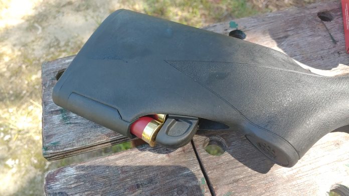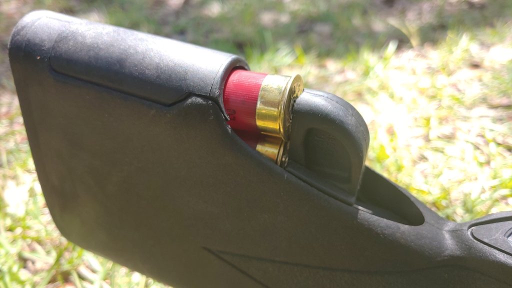 That wasn’t a concern for me. I’m a 2.75-inch fella myself. The stock uses a spring with a follower as well as a spring-loaded gate to keep the rounds from popping out before they are needed.
