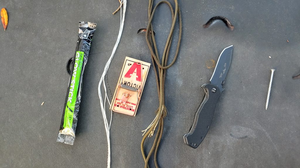 You’ll need a good quality mousetrap and a glow stick, obviously. You can find plenty of either on Amazon or at Walmart. Next, you’ll need a means to attach the mousetrap to a fixed location. I used nothing but the innards of 550 cord, but you can use zip ties, duct tape, whatever is on hand.