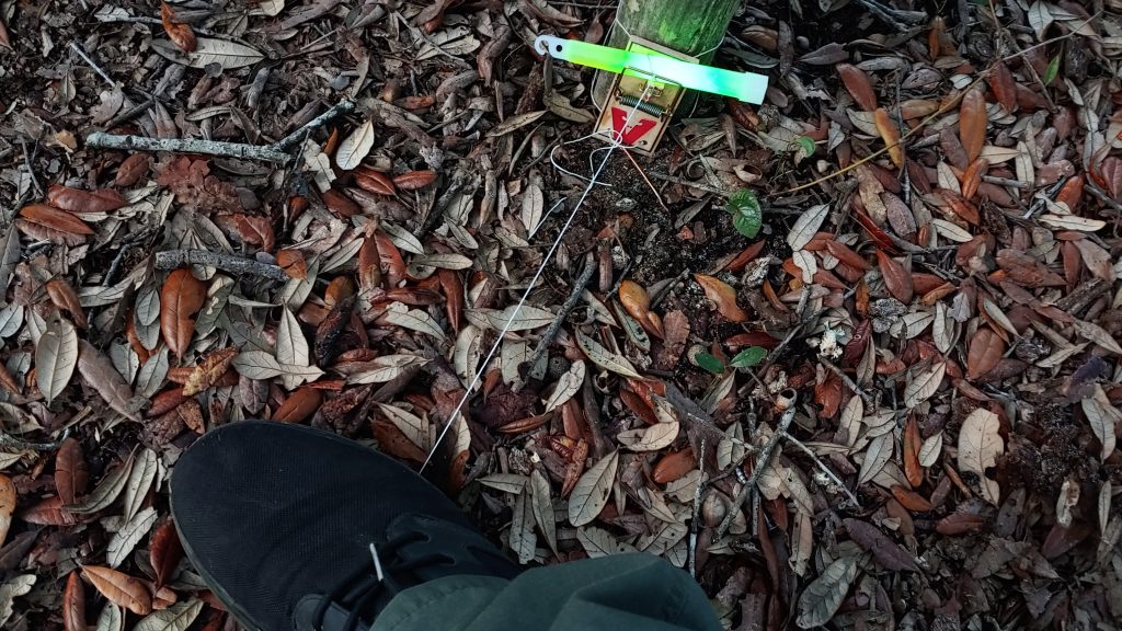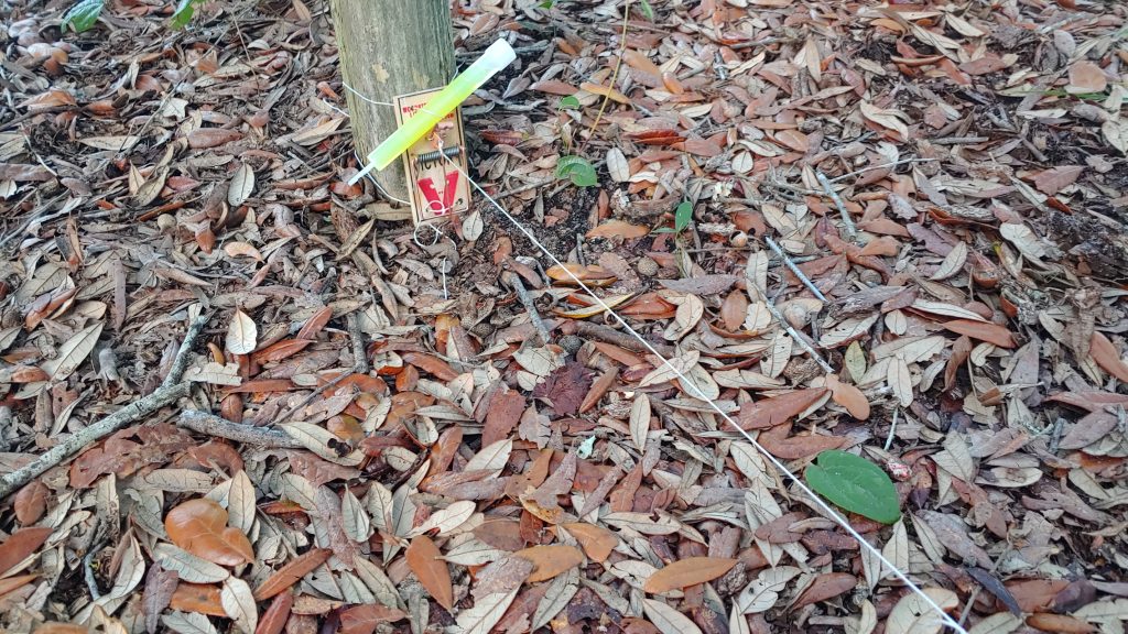 Your actual tripwire should run from the notch that’s in the metal petal out to the other tie-off location—tied both ends before setting the trip. Leave a hair of slack, or the trap won’t lock. Too much slack, and it won’t trigger when something hits the tripwire. I set the tripwire about four inches off the ground.