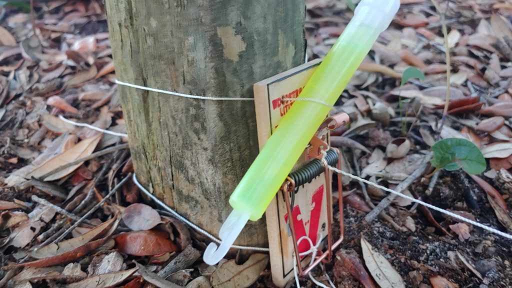 You can run the glowstick vertically or horizontally, and it doesn’t really matter. It depends on how you’ve set the trap up. The glowstick just needs to be within the kill bar to be activated. This means to can also just attach it to the tree instead of attaching it to the mousetrap.