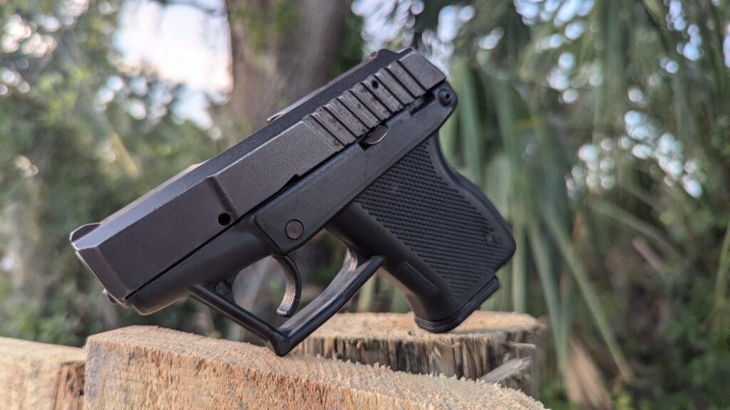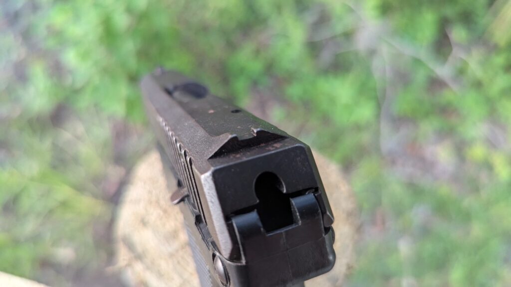 The sights suck. They are super small and have zero contrast. They are fast to find and would limit you to close-range shooting. That, and the double action only trigger, doesn’t help a whole lot, either. The DAO trigger isn’t terrible. It’s a 12-pound trigger, and it’s fairly smooth but long. I was surprised by how well the gun shot.
