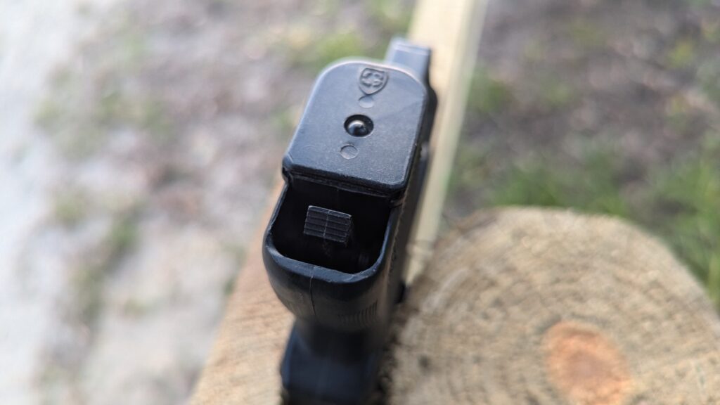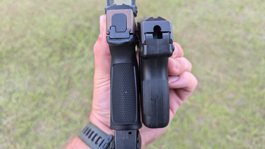 The gun lacks a traditional American magazine release. We also don’t have your typical European release. The release is not technically heel-mounted but acts as a heel-mounted magazine release. Instead, the magazine release is a lever that sits inside the grip. The grip completely hides it and it doesn’t extend below the grip.