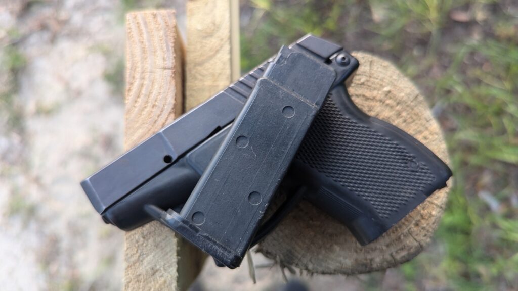 I don’t shoot this gun much because if it breaks, it breaks. However, I can’t spend 40 bucks on an ancient mag and not give it a try. The gun uses a direct blowback operating system, but unlike most .380 blowback guns, it’s not brutal. The thick as a Snicker grip helps dissipate a lot of that recoil and makes the gun substantially easier to control.