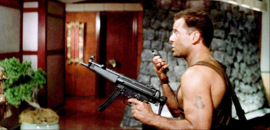Even though the main character’s name is different, the general idea is the same. Man flies out to California to visit family during Christmas. Terrorists storm the building and a lone, barefoot man fights them off. The story changes a little bit with the details, but if I broke the two stories down to their outlines, it’s all the same. One big difference gun nerds like me will notice is the guns.