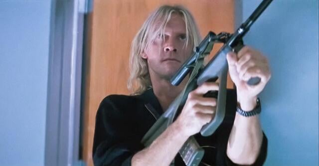 One thing the books and movie have in common is Karl. The blonde, hulking German terrorist. Leland describes him as a big blond German who looks like a rockstar. That fits both the book and movie Karl. In the film, Karl carries the futuristic Steyr AUG. The AUG is a 5.56 caliber bullpup assault rifle that was fairly revolutionary. Not only was it a bullpup, but it used tons of polymer to lighten the load and had an integrated optic. In 1988 it looks like a blaster from the future.