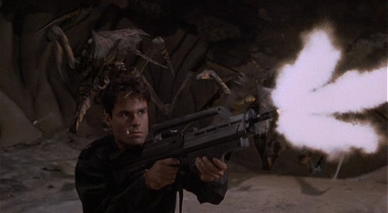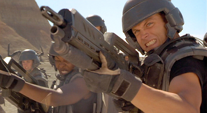 Like most 1990s sci-fi action flicks, Starship Troopers used real guns, but they were dressed up to be sci-fi-infused. The film isn’t necessarily famous for its gun handling, but throughout the film, over 300,000 blanks were used. There is a fair bit of gunplay, and one thing the film got right was the commonality of one weapon platform rather than several.