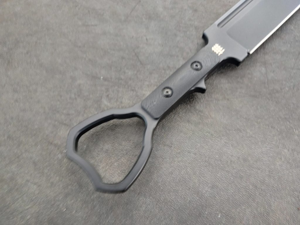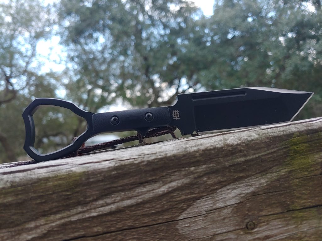 The handle features a slight spur that identifies the side of the blade that is edged. Halfbreed calls this a live edge identifier, and it gives you tactile assurance of which side the blade sits on. The top of the ring features a slight concave to grant space for your thumb to help with downward force. Inside the ring is plenty of room to keep your finger from being jammed into the ring when you apply that downward force.