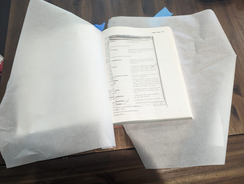 I made the mistake of cutting before I started gluing, and it was a pain. So let’s glue first. Take your wax or new paper or whatever medium to have. Open the book up to the first hundred pages and place the wax paper over the first hundred pages. Now do the same for the last hundred pages. The paper protects the pages from the glue.