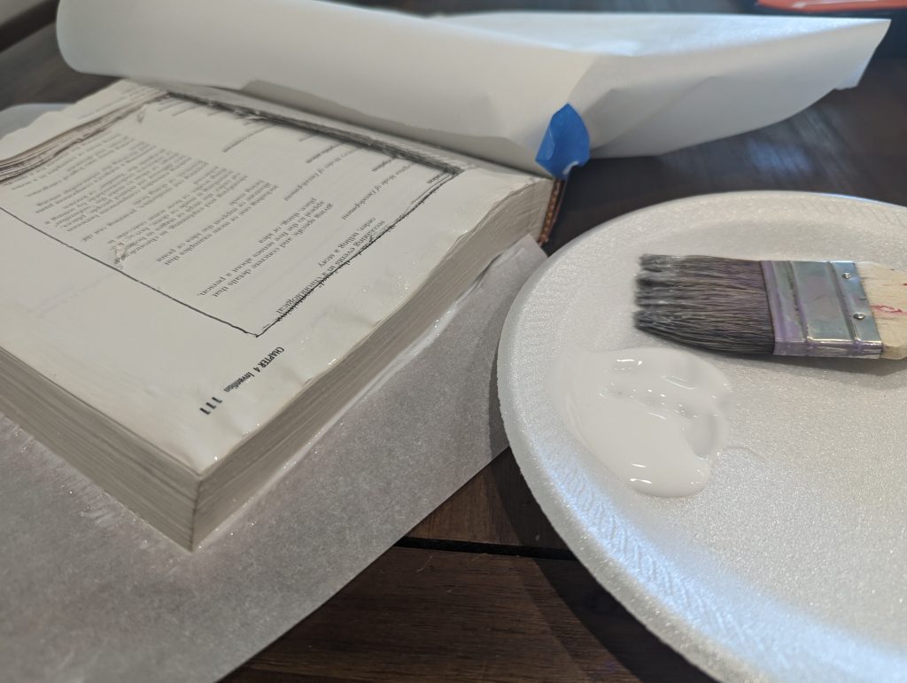 Between the first and last 100 pages, we will carve our compartment. Use the paintbrush to apply glue to the compartment pages. Be generous with it. Once it’s all glued, take a break and let it dry.