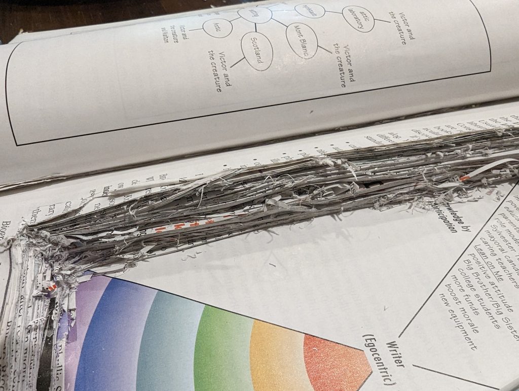 I found the book wouldn’t close well because of the cuts closest to the middle of the book. The paper bent upwards naturally. In this case, I used my Exacto and carved a little hump downwards. This allowed the book to close flat without issue. It might not happen with everyone, but it’s worth noting.
