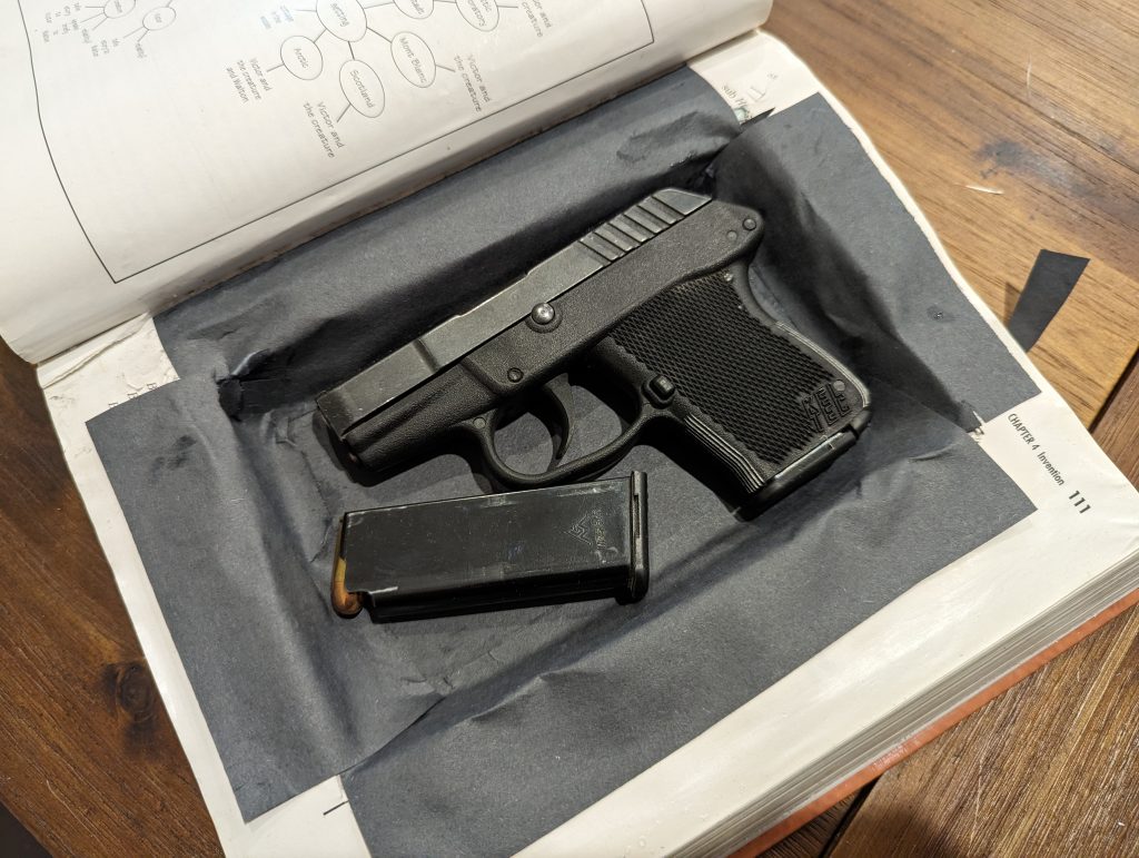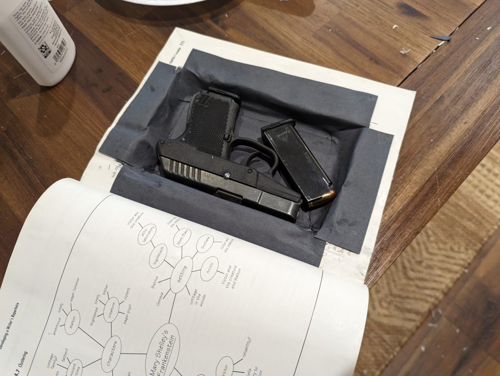 First, we need a thick book, a boring book too, one not likely to draw eyes and investigation. An aforementioned college textbook is perfect for that. It needs to be thicker than you think too. A small gun is tough to conceal, so bigger is better. Besides the book, you’ll need the following: