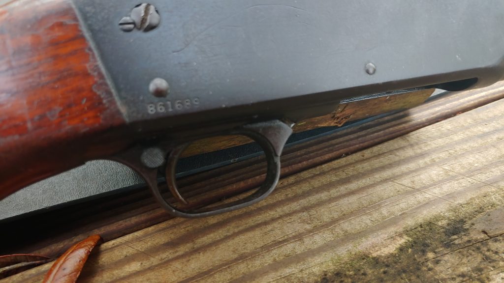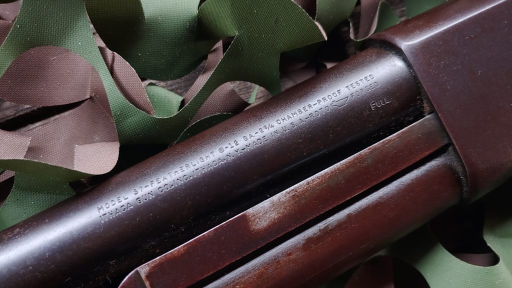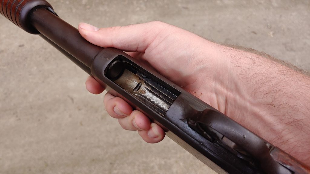 Another feature in Ithaca 37’s produced prior to 1975 is the lack of a disconnector. This means if you hold the trigger and pump the gun, it will fire as soon as the pump closes. This makes dispensing those shells and that hate very quick. This 1950s built Ithaca 37 lacks the disconnector, and I will say it’s a very effective technique that makes it easy to empty a magazine tube in mere seconds.