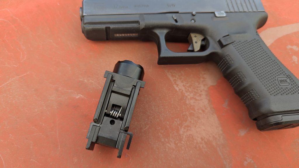 It turned out to be way too tight for every gun I had except for the Glock rail. Even then, it was tight enough it shaved off a little polymer as I shoved it on. The release is a spring-loaded design that is pressed down to install and remove. A small hump on the release locks onto your rail.