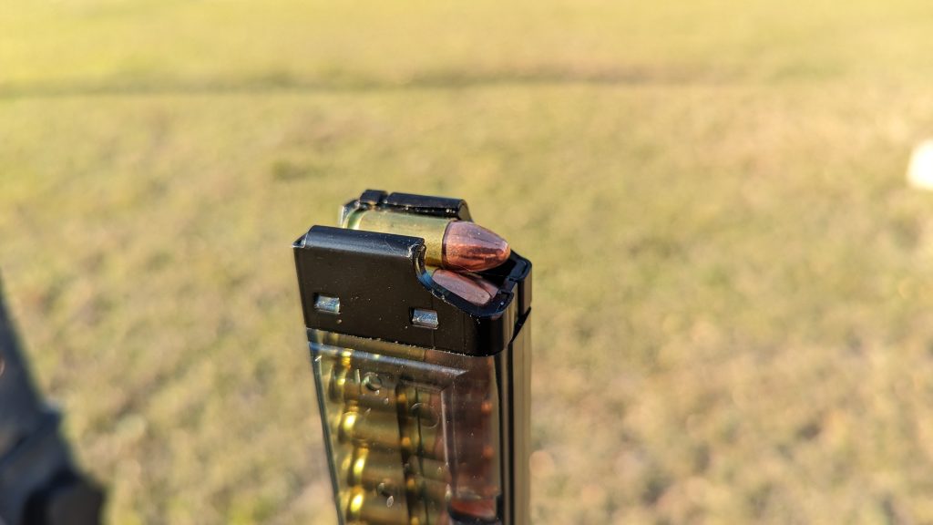 Outside of reload drills, I loaded the magazine and let it drop on concrete. I dropped it at different angles, including directly on the feed lip. When dropped fully loaded, a round or two will fly out, but no more than two have ever popped out. The magazine body didn’t break, and the metal feed lips didn’t falter. The KCI APC9 magazines feel solid and well-made.
