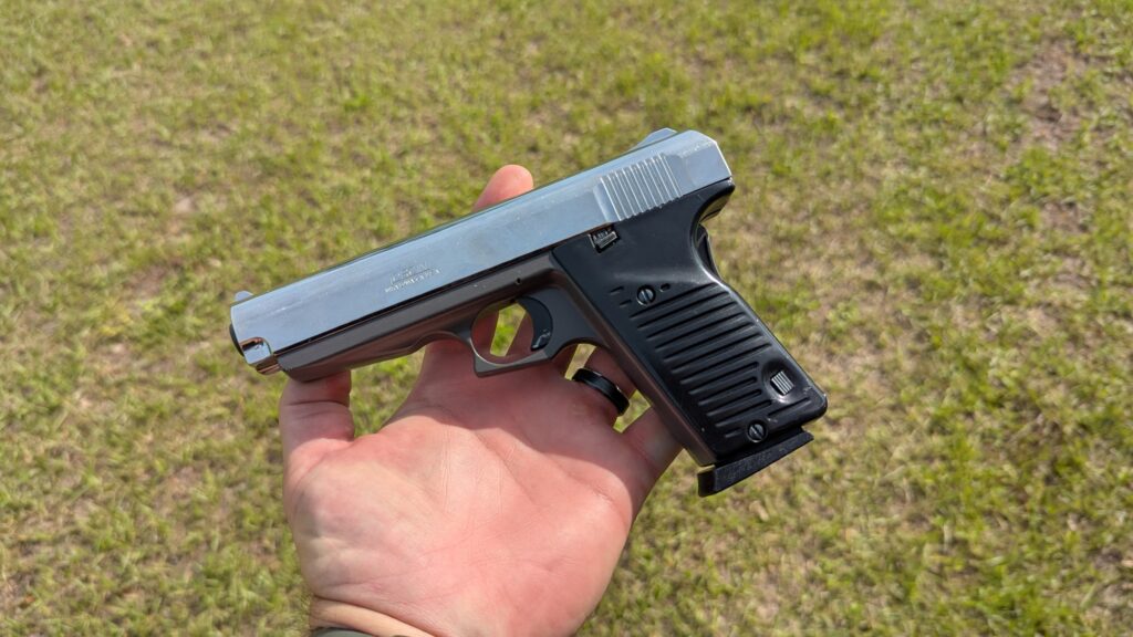 A tiny safety lever sits on the frame, accentuated by where the thumb rests. There’s also a grip safety, which is an interesting touch for such a firearm. The L9 is not an ergonomic gun. It’s wide, it’s heavy, and you can tell it’s made from sub-standard materials.