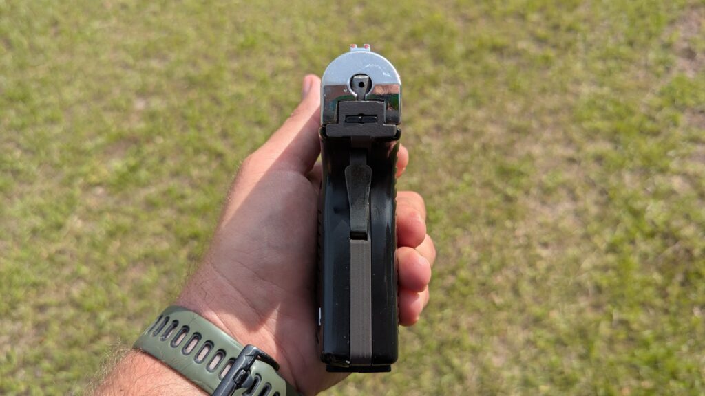 This action sends the heavy slide rocketing backward, creating a fairly intense recoil impulse. It’s a 9mm that recoils more like a 10mm. The heavy slide creates excessive recoil and muzzle rise, pulling the gun up and off target, then racing forward and slamming home. When it slams home, it pushes the entire gun down. It’s not a very pleasant recoil impulse and leads to slow and inaccurate shooting.