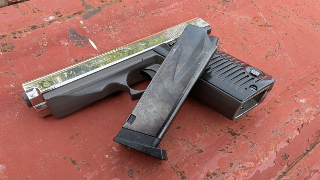 The sights do have red dots to provide contrast against the chrome finish. They are easy to see and align. The trigger, however, is terrible—like, really bad. It’s gritty, heavy, and its weight seems to jump around. It’s heavy, then it simply breaks with no discernible wall or lead-up; you just pull against a dead weight until the gun fires.