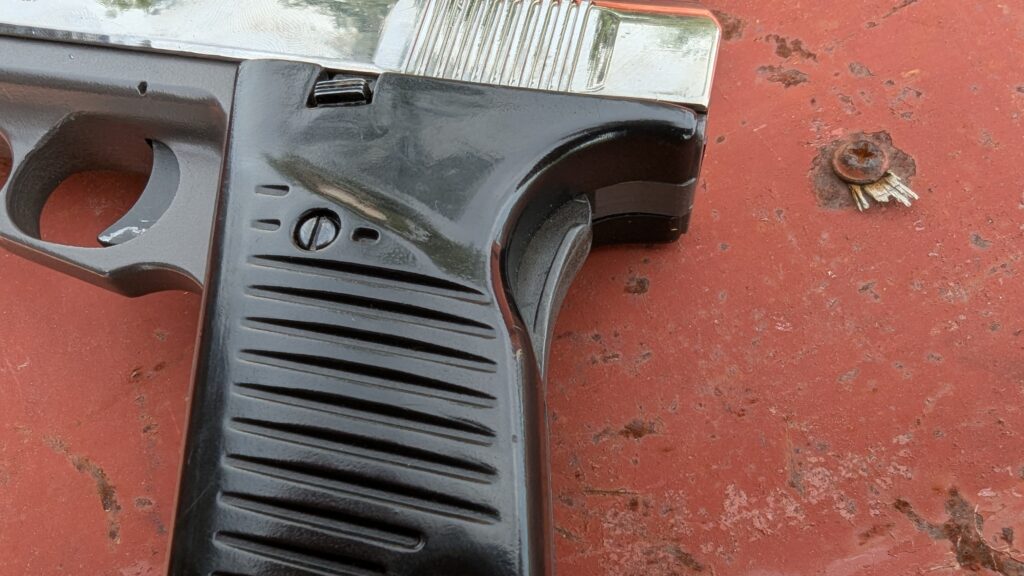 The cheap design incorporates numerous cost-saving measures. The sights are built directly into the slide as part of the Zamak mold. The magazine release is located at the bottom of the grip, a budget-friendly solution. The magazine itself seems to be a proprietary design due to the magazine catch. Interestingly, the magazine will not lock into the gun when fully loaded, requiring it to be downloaded by one round.