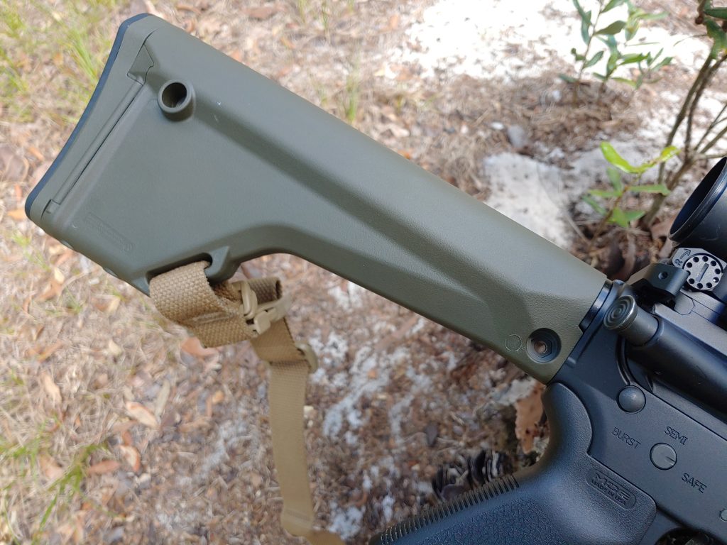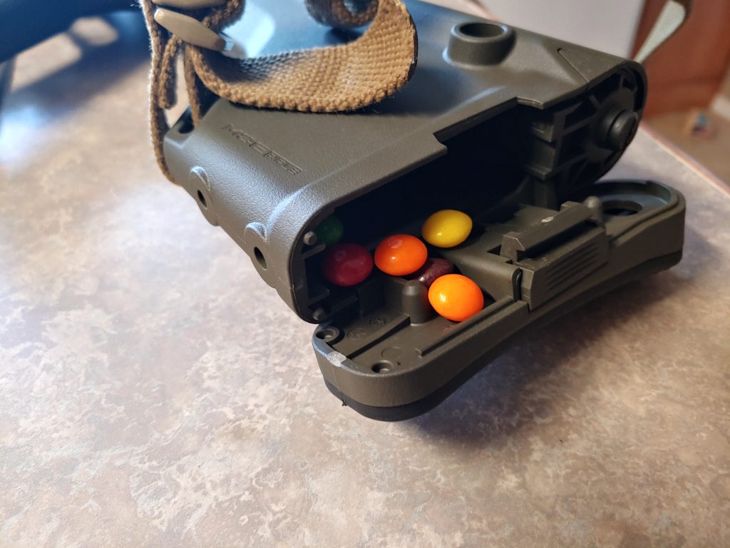 Additionally, the stock’s length is always the same, and I always know what to expect when I throw it to my shoulder. The Magpul MOE stock also gives you a rather larger storage compartment for stashing cleaning gear, spare parts, and even Skittles.