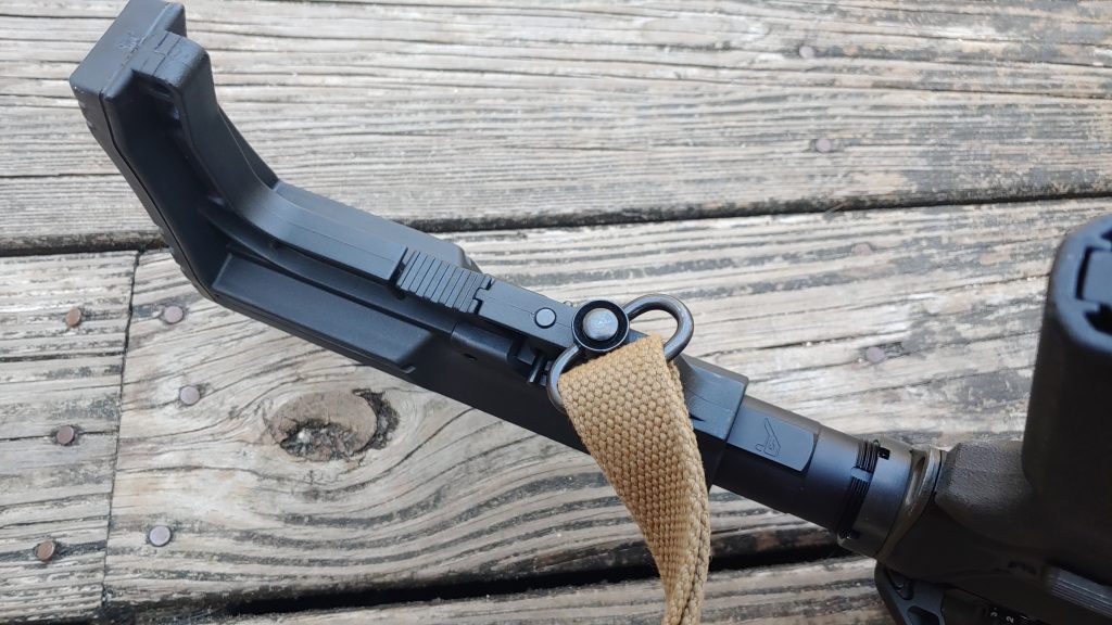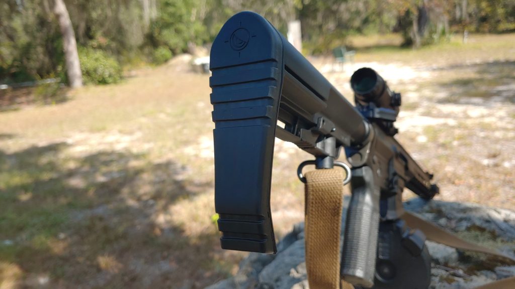 The stock advertises itself as minimalist, and that’s true, but the shoulder pad isn’t. It’s fairly wide and makes great contact with the shoulder. It’s as wide as some of the larger stocks on the market. A decent cheek weld and good shoulder contact are nice. I used my angled foregrip to pull it in tight.