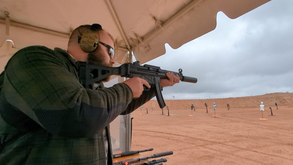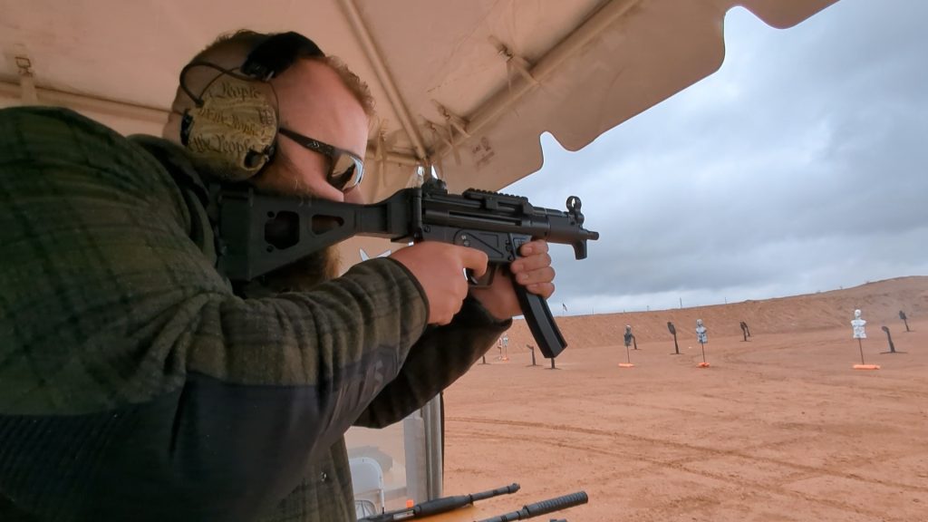 The MAC-5 series comes in a standard full-size model, as well as a K model that’s got that short and sweet barrel. The MAC-5 series will ship with two mags, a simple single-point sling, and a nice hard case. The sights are all standard MP5 with the rotating drum you either love or hate. The models at range day were equipped with braces, but those are add-ons and not included with the gun.